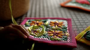 Using modern materials to pay homage to the traditional art form of ie toga weaving, Serene Hodgman is putting a modern spin on it by adorning plastic beach mats with silk ribbon.