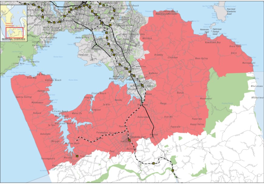It also includes some rural land from the Howick, Manurewa, and Papakura local board areas.