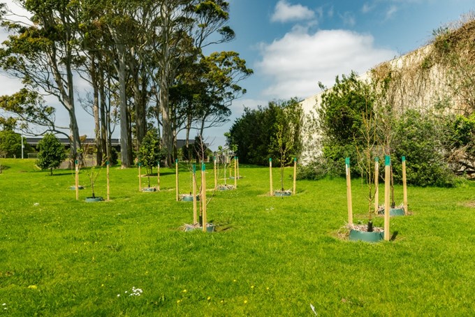 Seventeen fruit trees have been planted at Puhinui Domain in Papatoetoe as part of the fruitful rejuvenation project. The new orchard features fig, apple, nectarine, peach, and Japanese plum trees, along with edible shrubs like bay. Once mature, these trees will provide fresh fruit for the community. Careful planning has also included native trees, such as pūriri, which offer food for native birds nearly year-round. The kererū enjoy the fruit, while tūī and korimako (bellbirds) savour the flowers.