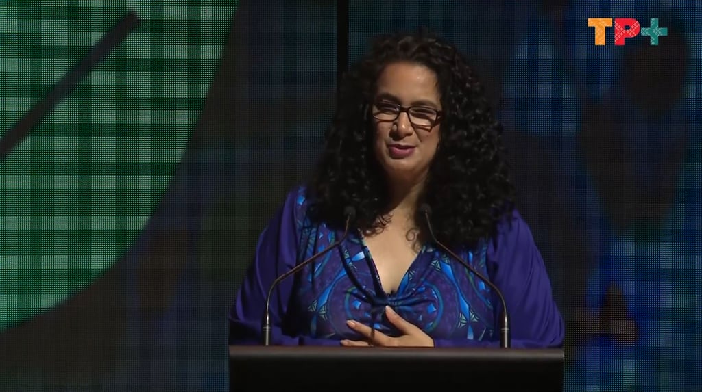 Event Producer of the Pacific Music Awards gives her speech at the 2024 awards celebration.