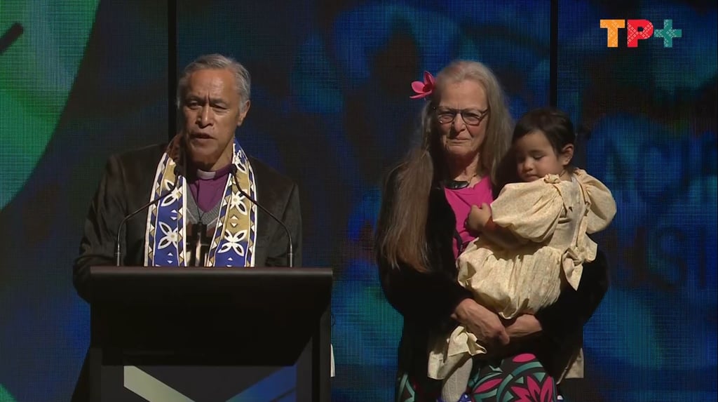Chairman of the Pacific Music Awards Trust Rev Mua Strickson-Pua delivers his speech at the 2024 Pacific Music Awards.